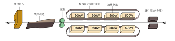 熱封縫合工作流程:袋口清潔(備選)→內袋熱封(4組加熱塊加熱:聚四氟乙烯封口帶使加熱塊與袋子不直接接觸,以保護袋子外表不與加熱塊粘連)→壓輥壓合→袋口折邊→縫包機:外袋縫紉